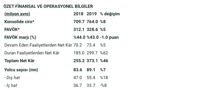 İstanbul Atatürk Havalimanı hariç ciromuz yüzde 8 artarak 764 milyon avroya ulaştı. İstanbul hariç FAVÖK’ümüz ise yüzde 5 artarak 329 milyon avro oldu. FAVÖK büyümemiz Gürcistan’ı etkileyen Rus uçuş yasağı nedeniyle sene başında açıkladığımız hedefin yüzde 1 altında kaldı. Toplam net karımız 373 milyon avro olarak gerçekleşirken, devam eden faaliyetlerimizden elde ettiğimiz net kâr yüzde 5 artışla 73 milyon avro oldu. 2019 yılı içerisinde toplam 69,5 milyon avro tutarında yatırım harcaması gerçekleştirdik.