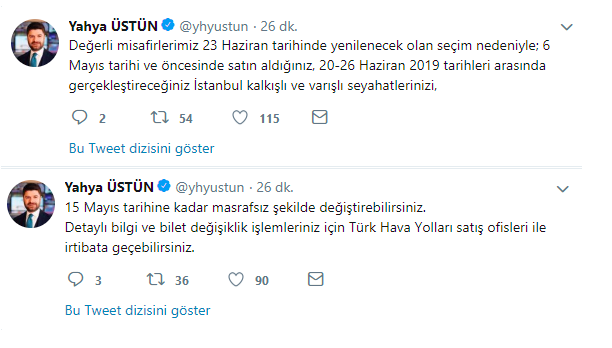Türk Hava Yolları Basın Müşaviri Yahya Üstün: 6 Mayıs tarihi ve öncesinde satın aldığınız, 20-26 Haziran 2019 tarihleri arasında gerçekleştireceğiniz İstanbul kalkışlı ve varışlı seyahatlerinizi, 15 Mayıs tarihine kadar masrafsız şekilde değiştirebilirsiniz.