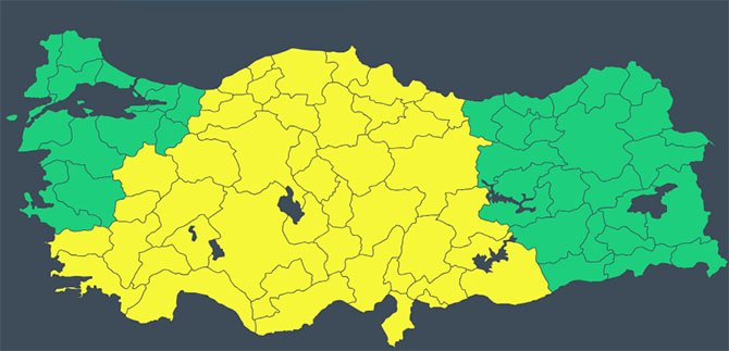 SARI KODLA UYARI YAPILAN İLLER: Adana, Adıyaman, Afyonkarahisar, Amasya, Ankara, Antalya, Aydın, Bolu, Burdur, Çankırı, Çorum, Denizli, Eskişehir, Gaziantep, Hatay, Isparta,Mersin, Kastamonu, Kayseri, Kırşehir, Konya, Kütahya, Malatya, K.Maraş, Muğla, Nevşehir, Niğde, Ordu, Samsun, Sinop, Sivas, Tokat, Şanlıurfa, Uşak, Yozgat, Zonguldak, Aksaray, Karaman, Kırıkkale, Bartın, Karabük, Kilis, Osmaniye, Düzce.