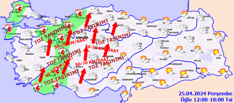 TOZ TAŞINIMI UYARISI: İç Ege, Batı Akdeniz, İç Anadolu ile Batı Karadeniz’in iç kesimlerinde yer yer toz taşınımı beklendiğinden, görüş mesafesinde düşme, hava kalitesinde azalma ve ulaşımda aksamalar gibi olumsuzluklara karşı dikkatli ve tedbirli olunmalıdır.
