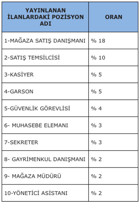 Bütün sektörler genelinde satış temsilcisi her dönemde en çok aranan pozisyon iken, ekim ayında bir ilk gerçekleşerek mağaza satış danışmanlığı, diğer sektörlerin satış uzmanı ihtiyacını ciddi oranda geçti. Kasiyer ve garson ise sıralamada birer basamak yukarı çıktı