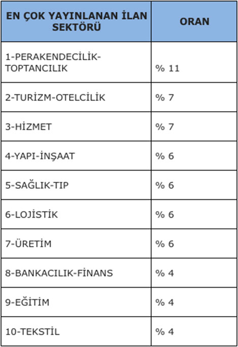 Ekim ayında en çok ilan veren turizm-otelcilik sektörü, yaz aylarına göre eleman ihtiyacı azalsa da ikinci sırada yer aldı. Hizmet, sağlık ve lojistik sektörlerinde ise eleman arayışının arttığı gözlendi. Hizmet sektörü 7.sıradan ekimde 3. sıraya yükseldi. Bankacılık-finans, 12. sıradan 8’e yükselerek en fazla iş ilanı veren ilk 10 sektör arasında yer aldı.