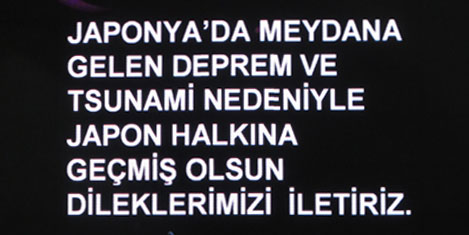 Türkiye"nin bulunduğu 3 numaralı salondaki ekranda İngilizce, Almanca ve Türkçe olarak Japonya"da meydana gelen deprem ve tsunami nedeniyle Japon halkına geçmiş olsun dileklerimizi iletiriz denildi.