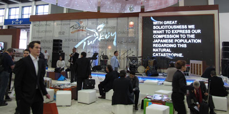 BERLİN/ALMANYA- ITB Berlin 2011 Turizm Fuarı"nda Türkiye Japonya"da meydana gelen deprem ve tsunami felaketi için büyük bir jest göstererek müzik ve eğlence yayını durdurarak ekranda mesaj yayınladı.