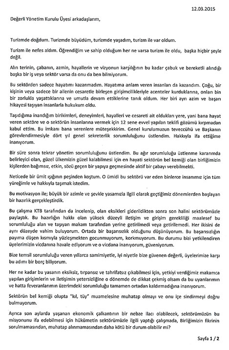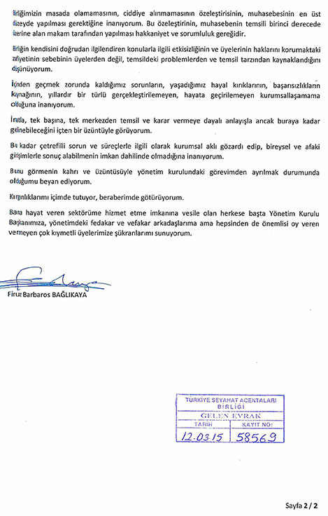 Firuz Bağlıkaya'nın Türsab yönetiminden istifa mektubu: