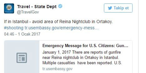 İSTANBUL- İstanbul Ortaköy'de gerçekleştirilen ve 39 kişinin hayatını kaybettiği terör saldırısısonrası bir açıklama yayımlayan ABD Dışişleri Bakanlığı, "İstanbul Ortaköy’deki gece kulübünde ateş açıldığı yönünde haberler alınmaktadır. Çok sayıda kişinin öldüğü duyumu alınmıştır" satırlarına yer verdikten sonra vatandaşlarını saldırının olduğu bölgeden uzak durmaları konusunda uyardı.
