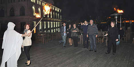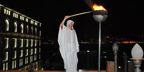 Eğlencenin ilerleyen saatlerinde Vira Restoran"ın çatısında bembeyaz kıyafetler içinde elinde yanan meşale ile terasa çıkan görevli bereketin sembolü olarak konuklara gösteri sundu.