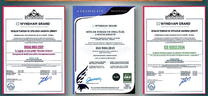 2018’de The Seven Stars Luxury Hospitality and Lifestyle Awards Avrupa’nın En İyi İş Oteli ödülünü alan Wyndham Grand Kalamış, hizmet ve performans sürecini dünyanın en yaygın kalite yönetim standardı olan, ISO 9001:2015 Kalite Yönetim Sistemi Belgesi ile standarda bağladı.Böylece Wyndham Grand Kalamış Hotel, üst yönetimi dahil tüm personeline, misafiri memnun edebilecek aktif yönetim yapılanmasını ve kalite kavramını aşıladı. Belge kapsamında uygulamaya yönelik sertifikalı personel eğitimleri ve dış denetimlerle 5 yıldızlı otel ISO 9001:2015 Kalite Yönetim Sistemleri Belgesini almaya hak kazandı.