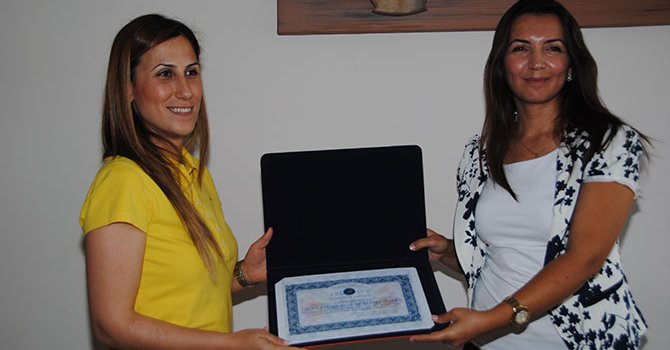 KKTC Ekonomi ve Turizm Bakanlığı İstanbul Temsilcisi Afet Değirmenci, Kuzey Kıbrıs'taki oteller adına plaketleri Kültür ve Turizm Bakanlığı Tanıtma Genel Müdür Yardımcısı İbrahim Yazar'dan aldı.