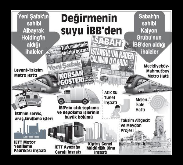 İSTANBUL-Yeni Şafak’ın sahibi Albayraklar ve Sabah‘ın sahibi Kalyon, İBB’den aldıkları ihalelerle büyüdü.34.8 milyar TL’lik bütçesi ve şirketlerinin 24 milyar TL’lik cirosuyla İBB, yandaş şirketlerin en büyük gelir kaynaklarından biri konumunda.