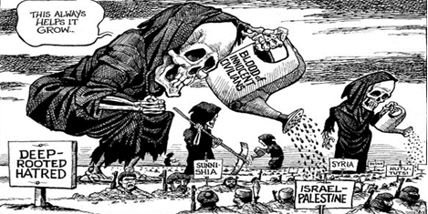Aynı şekilde Gazze'ye yürüyen ve önüne geleni vurup geçen bir Israel ordusu. Çoluk çocuk, kadın erkek demeden insanları yurtlarında vuruyorsun, yataklarında öldürüyorsun. Kimsin sen? Kime güveniyorsun. Yukarıdaki karikaturdeki ölüm tarlalarını sulayanlara mı? Menfaatleri için insan kırımı yapan bu zalimlerin yatacak yerleri yok bilesin. Peşinde oldukları petrol ve onun parası onları yokedecek.