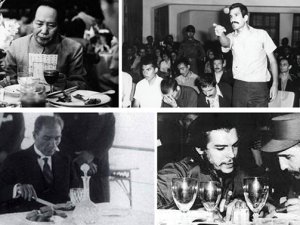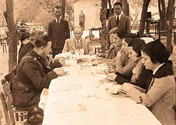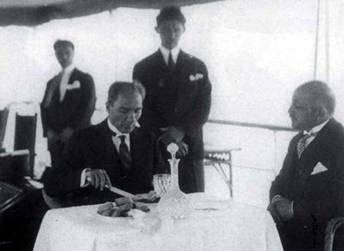 Atatürk’ün sofralarının, Yakup Kadri Karaosmanoğlu, Ruşen Eşref Ünaydın, Yunus Nadi ve gerektiğinde İsmet İnönü ile Mareşal Fevzi Çakmak gibi gedikli konuklarından Falih Rıfkı Atay “Atatürk’te On bir Gün Misafirliğim”de çeşitli günlerde çıkan yemekleri sıralar: Çorba, pirinçli et suyu, külbastı, but köfte, pirzola, yoğurtlu kebap, ograten patlıcan, kıymalı patlıcan, yeşil fasulye, ciğerli pilav, tavuk, kuşkonmaz, ıspanak püresi, börek, muhallebi, armut, elma, ayva kompostosu, kavun, üzüm, elma… Masada Fevzi Çakmak varsa, sofrada içki de yoktur!..